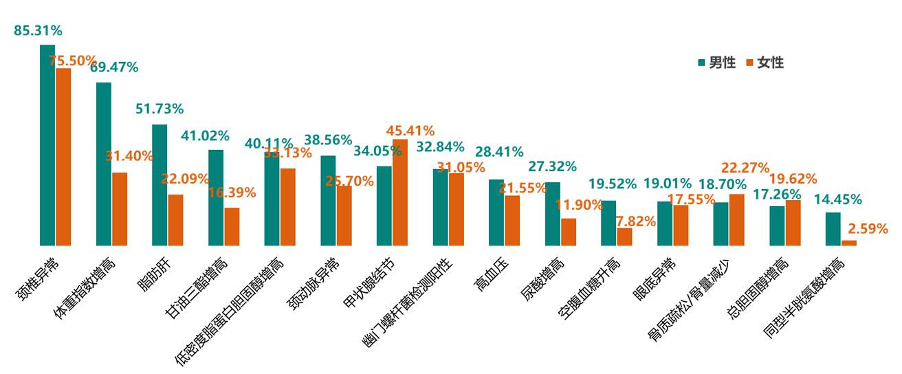 从总体上分析(排除前列腺异常、宫颈异常等性别相关的体检重要异常结果),颈椎异常的检出率最高,高达81.26%;往下依次为体重指数增高、脂肪肝、甲状腺结节、低密度脂蛋白胆固醇增高,其检出率均已经超过35%。