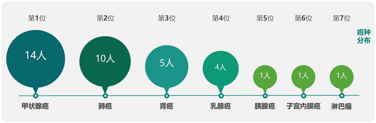 爱康集团通过对出现重大阳性异常中国企业家客户开展追踪、随访,目前已经发现36位客户患有癌症(由医院诊断确诊),人数排名前四的癌症分别为甲状腺癌14人、肺癌10人、肾癌5人、乳腺癌4人,其余为胰腺癌、子宫内膜癌、淋巴瘤,均发现1人。