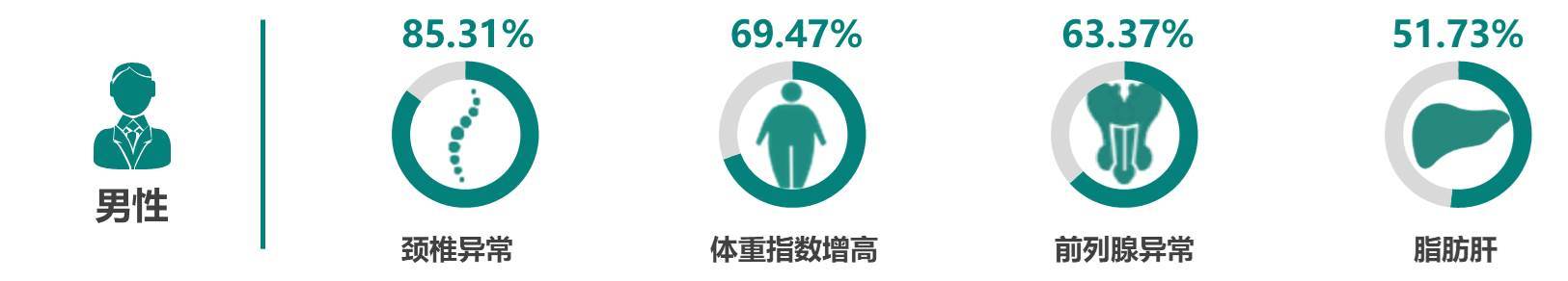 分性别来看,对于中国企业家男性客户来说,威胁最大的健康是颈椎异常,检出率为85.31%,其余较严重问题为体重指数增高、前列腺异常和脂肪肝等。