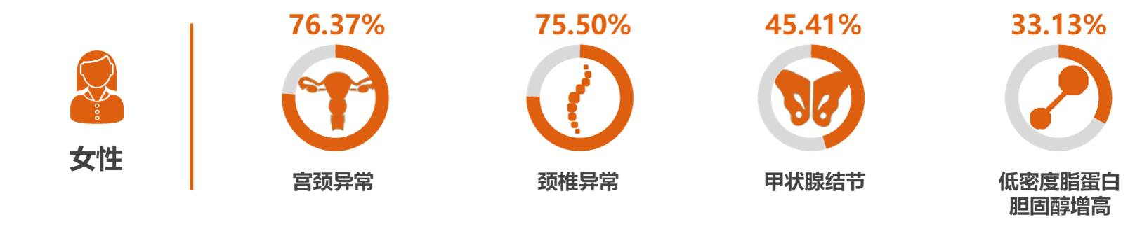 对于中国企业家女性客户来说,威胁最大的健康问题是宫颈异常,检出率为76.37%。其余较严重问题为颈椎异常、甲状腺结节和低密度脂蛋白胆固醇增高等。