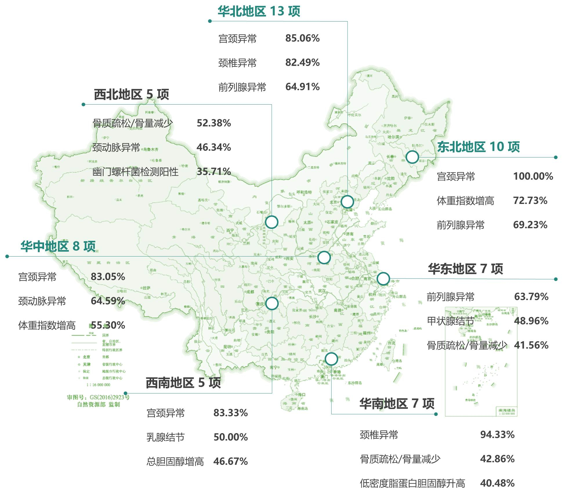 在2019年中国企业家客户体检重要异常结果检出率地区排名中,华北地区有13项异常检出率高于平均水平,其余比较严重的地区为东北和华中,分别有13项,10项异常检出率高于平均水平。