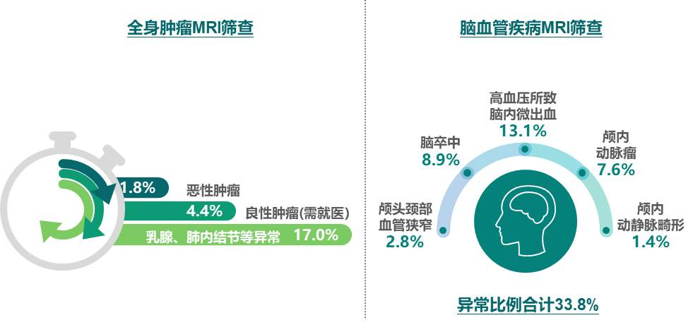 爱康君安磁共振医学影像中心于2018年对近千位客户进行了全身磁共振影像肿瘤筛查,结果发现,总体阳性检出率为23.3%,肿瘤发现率为6.3%,其中恶性肿瘤检出率为1.8%,远高于中国恶性肿瘤发病率0.3%。磁共振还可用于心脑血管疾病筛查,通过对参与心脑血管筛查的客户统计分析,发现主要心脑血管病的阳性率总共为33.8%,其中阳性率最高的疾病为高血压所致脑内微出血,为13.1%,其次为脑卒中,为8.9%。