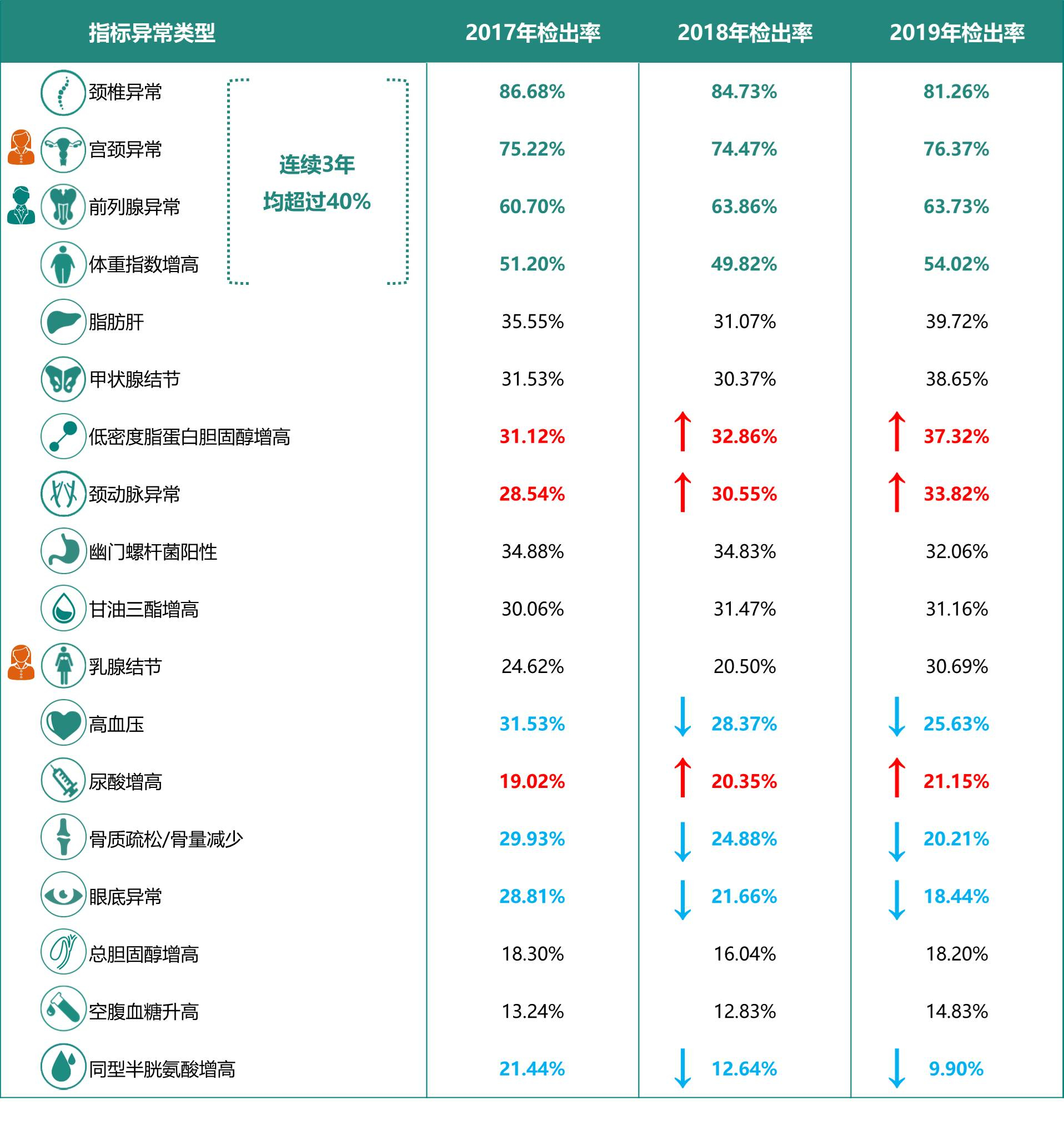 此次《中国企业家健康绿皮书》数据显示:在18项体检重要异常结果中,低密度脂蛋白胆固醇增高(提示血脂异常)、颈动脉异常、尿酸增高呈现逐年上升趋势。颈椎异常、女性宫颈异常、男性前列腺异常、体重指数增高检出率连续3年均超过40%,需要中国企业家客户重点关注。